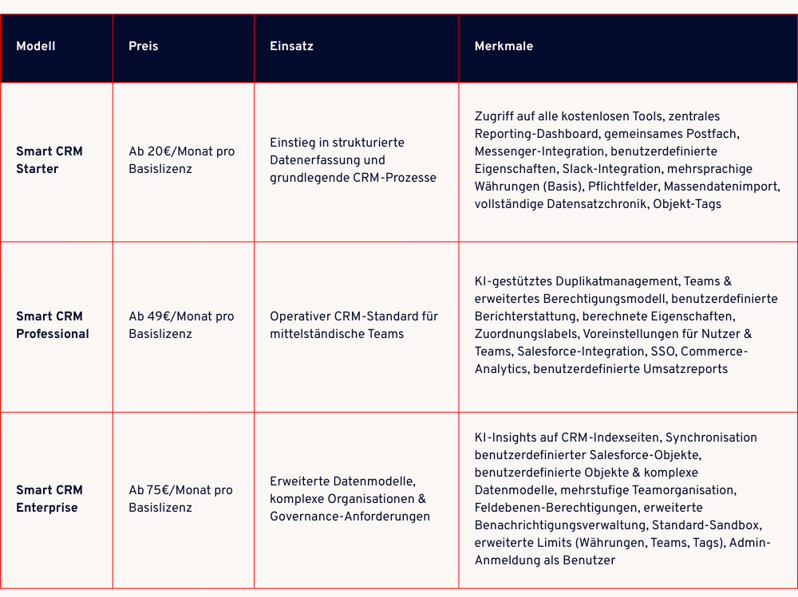Die Smart-CRM-Lizenzierung ist klar strukturiert. Unternehmen können Smart CRM entweder eigenständig erwerben oder über Premium-Hub-Produkte automatisch freischalten.